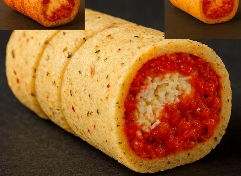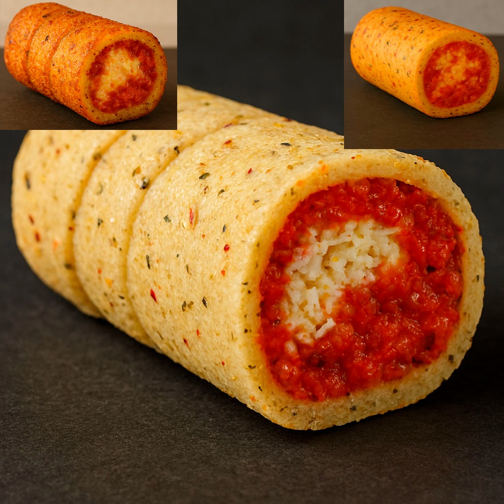 Delicada masa dorada que envuelve la fusión de queso con morrón, tomate y especias italianas. Un bocado elegante que recrea el auténtico sabor de la pizza, “El sabor de la pizza, en forma de tekeño.”